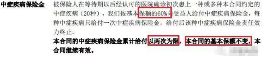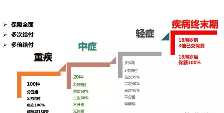 3、危急病、 中癥、輕癥是多次賠付,輕癥3次賠付中癥兩次,沒(méi)有分組,沒(méi)有間隔,增加賠付的概率;輕癥賠付比例仍在增加賠付,可以是賠付基本保額 35%、40%、45%,輕癥額外賠付,不占重疾保額。 中癥兩次賠付,每次根據(jù)基本保額60%賠付,賠付的比例打到最高市場(chǎng);