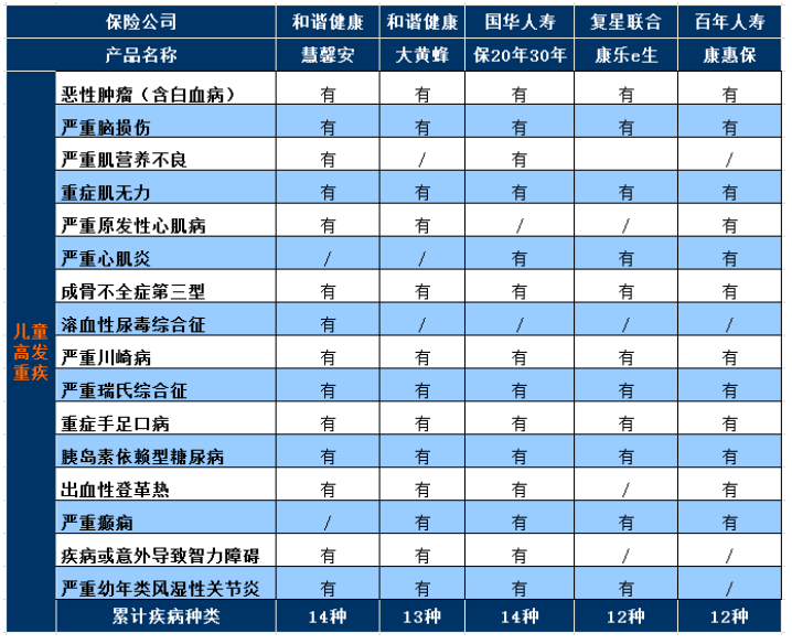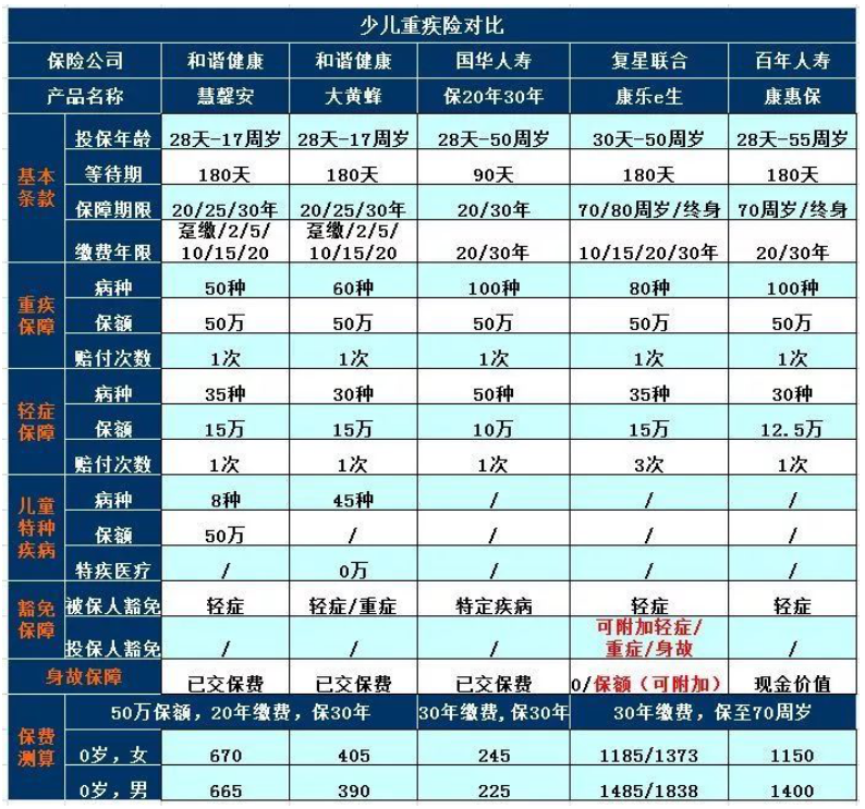 為了方便大家,我們將兒童的重大疾病保險(xiǎn)與市場(chǎng)上的高性?xún)r(jià)比進(jìn)行了比較。有幾種模型并不專(zhuān)門(mén)針對(duì)兒童的特定嚴(yán)重疾病,但保障也非常全面,如下: