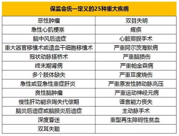 2007年,保險(xiǎn)業(yè)協(xié)會(huì)一致制定《重大疾病保險(xiǎn)的疾病定義使用規(guī)范》,統(tǒng)一各大保險(xiǎn)公司的疾病。因此,無論是50種嚴(yán)重疾病還是100種嚴(yán)重疾病,前25種保險(xiǎn)公司的定義都是相同的。