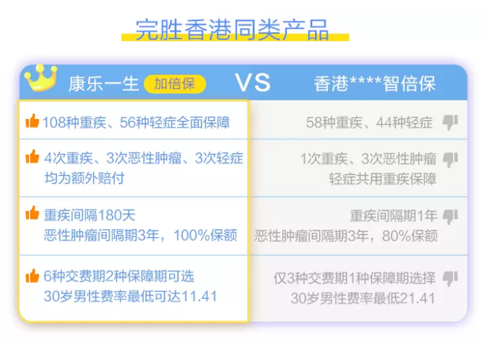 兩次重癥發(fā)病,間隔超過180天就可以獲賠,相比香港同類產(chǎn)品常見的1年間隔期,節(jié)省的半年可以彌補嚴重疾病的風(fēng)險。