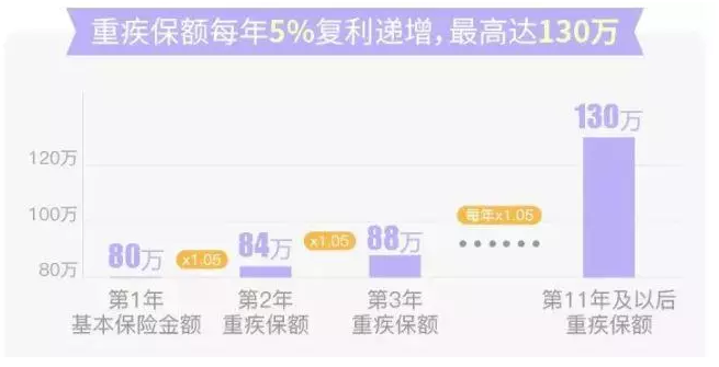 1、保額市面最高:保額將成長(zhǎng),前11年每年復(fù)合利息增加5%,最高可達(dá)130萬(wàn)