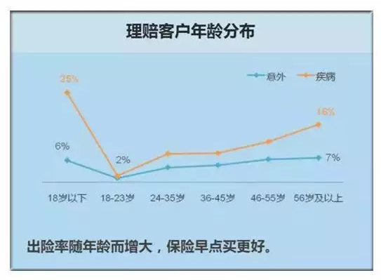 1、保費(fèi)是隨年齡變化的。成年人越老,保費(fèi)越高。下圖是2017年理賠報(bào)告中的太平洋理賠客戶年齡分布表,很明顯理賠年齡與費(fèi)率上升法基本相同。