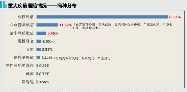 保險重大疾病保險不是更多類型的疾病,在重癥疾病保險中普遍存在的六大疾病:惡性腫瘤、急性心肌梗死、主要器官移植或造血干細(xì)胞移植、冠狀動脈旁路移植術(shù)、終末期腎病、中風(fēng)后遺癥占絕對比例(概率超過80%),這基本上滿足了一般保單持有人的保障需求,保障范圍涵蓋了50種嚴(yán)重疾病,遠(yuǎn)遠(yuǎn)超過保險行業(yè)協(xié)會定義的嚴(yán)重疾病數(shù)量(25種),覆蓋范圍賠付可以達(dá)到97%。就概率而言,其中有四十個和幾百個沒有太大的不同。
