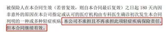 這意味著保險單在等待期間確認(rèn)為輕癥,而保險公司此時不是理賠,而是輕癥,但不會取消合同。如果發(fā)生輕癥并且合同終止,則不僅意味著理賠,而且將來也意味著保障。雙保護條款非常人性化,雖然這次輕癥不是賠付,但是合約沒有結(jié)束,保障總是存在的。