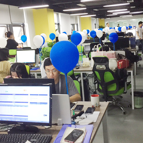 (公司整個(gè)工位上都放有藍(lán)白相間的氣球,遠(yuǎn)遠(yuǎn)望去就像一片藍(lán)藍(lán)的大海一樣,也希望多保魚這條小魚在互聯(lián)網(wǎng)金融的大海之上乘風(fēng)破浪,勇往直前。)