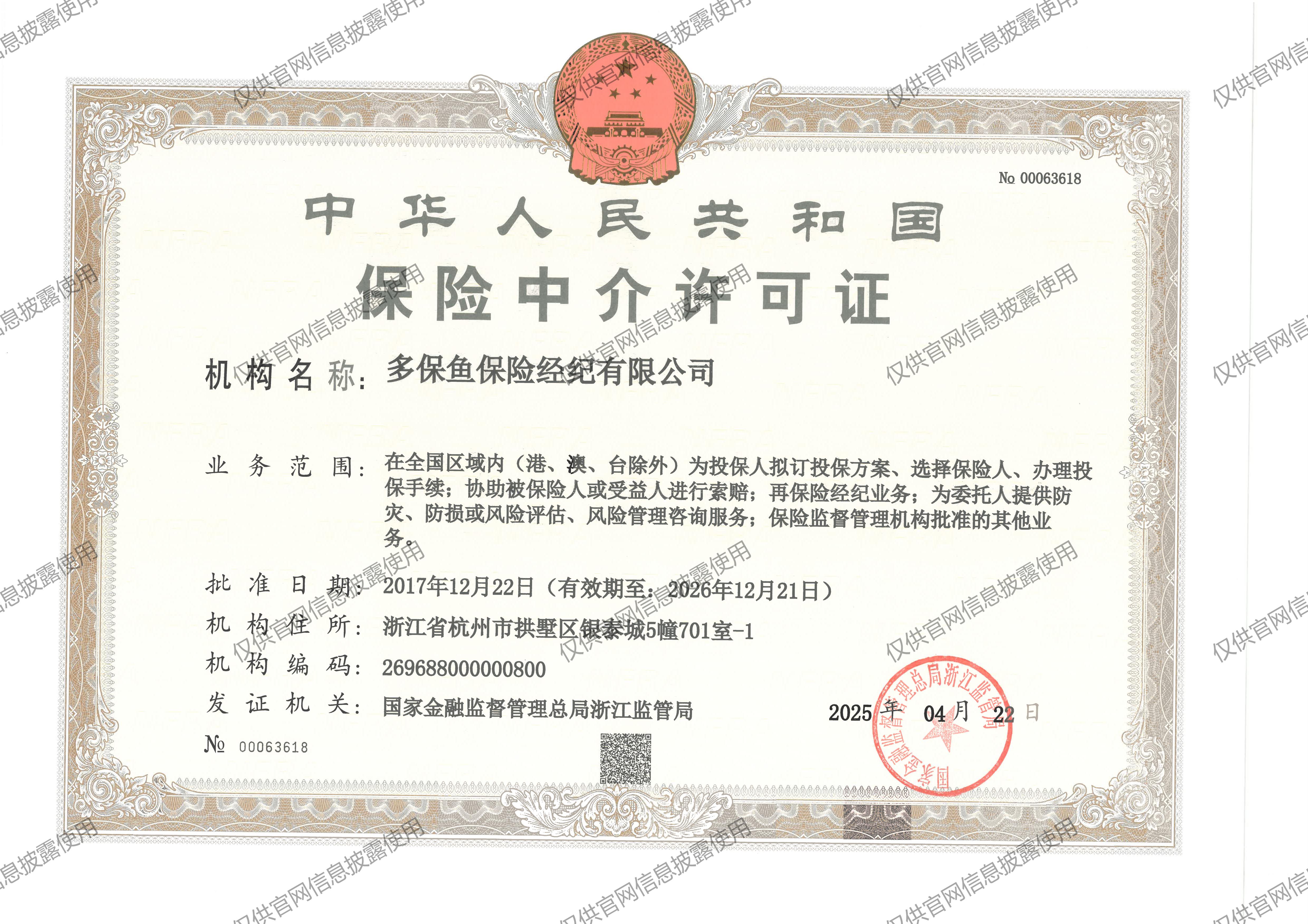 2019年8月,多保魚(yú)獲得全國(guó)性保險(xiǎn)資質(zhì)的商業(yè)保險(xiǎn)經(jīng)紀(jì)公司牌照,機(jī)構(gòu)編號(hào): 269688000000800。